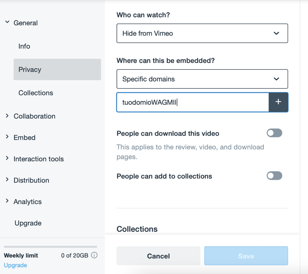 Per l’inserimento tramite VIMEO consigliamo di seguire la seguente guida per assicurarsi che l’inserimento sia fatto correttamente e in maniera Sicura. Vimeo intatti permette di proteggere i tuoi video e di impedirne il Download.