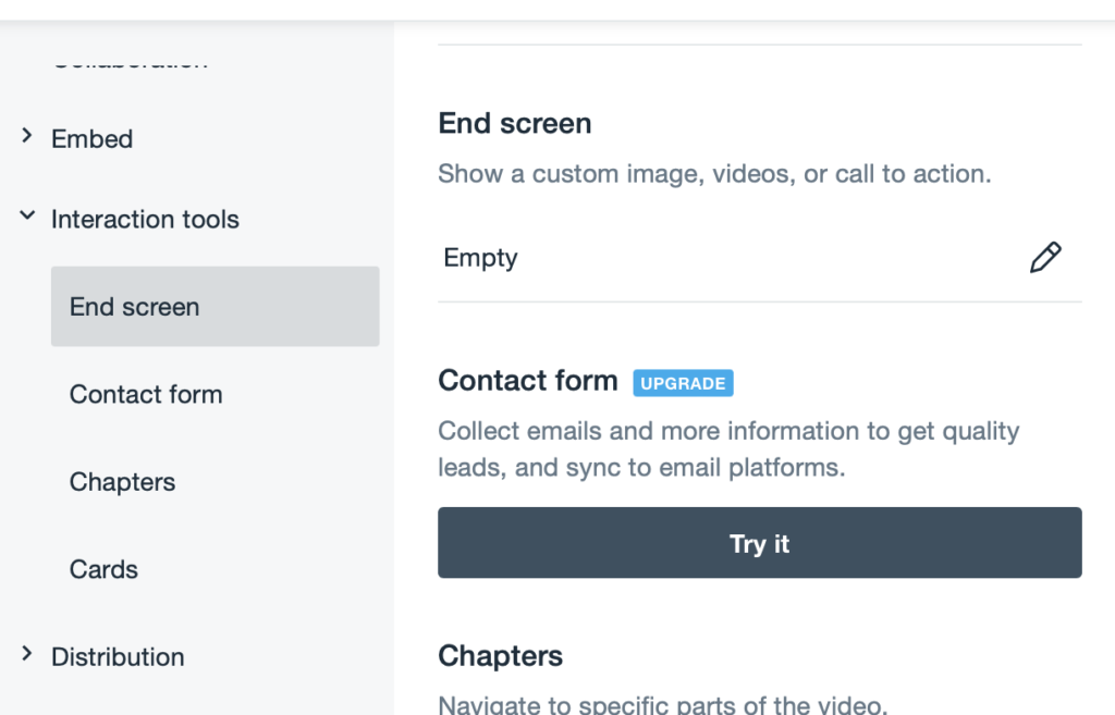 • Per la sezione INTERACTION TOOLS, modifica il parametro relativo all’end screen con EMPTY. Questo ti permetterà di non far visualizzare altri tuoi video al termine del video appena concluso dall’utente.