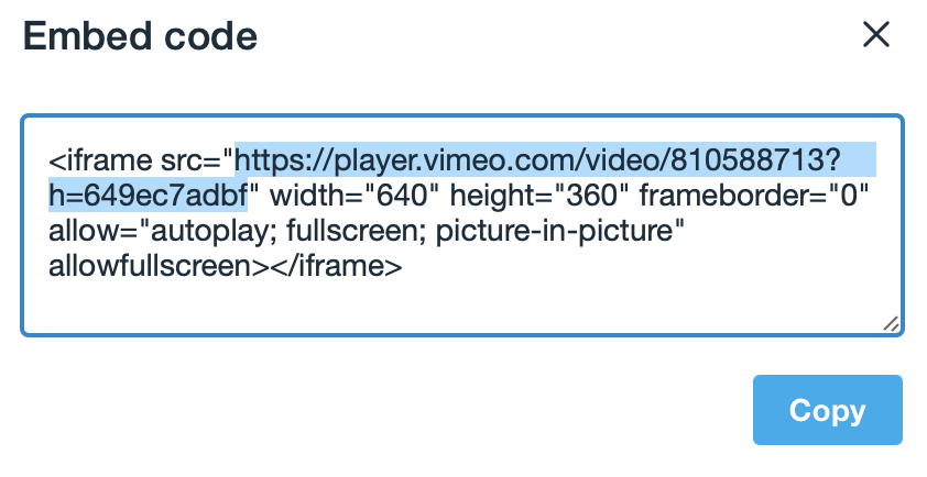 Una volta impostati tutti i parametri del video, puoi caricarlo tramite il link che trovi in alto a destra denominato EMBED CODE. Ti si aprirà un popup con un codice, dovrai copiare solo il link che trovi tra le “virgolette” che vedi evidenziato in BLU. Ogni video avrà il suo link univoco.