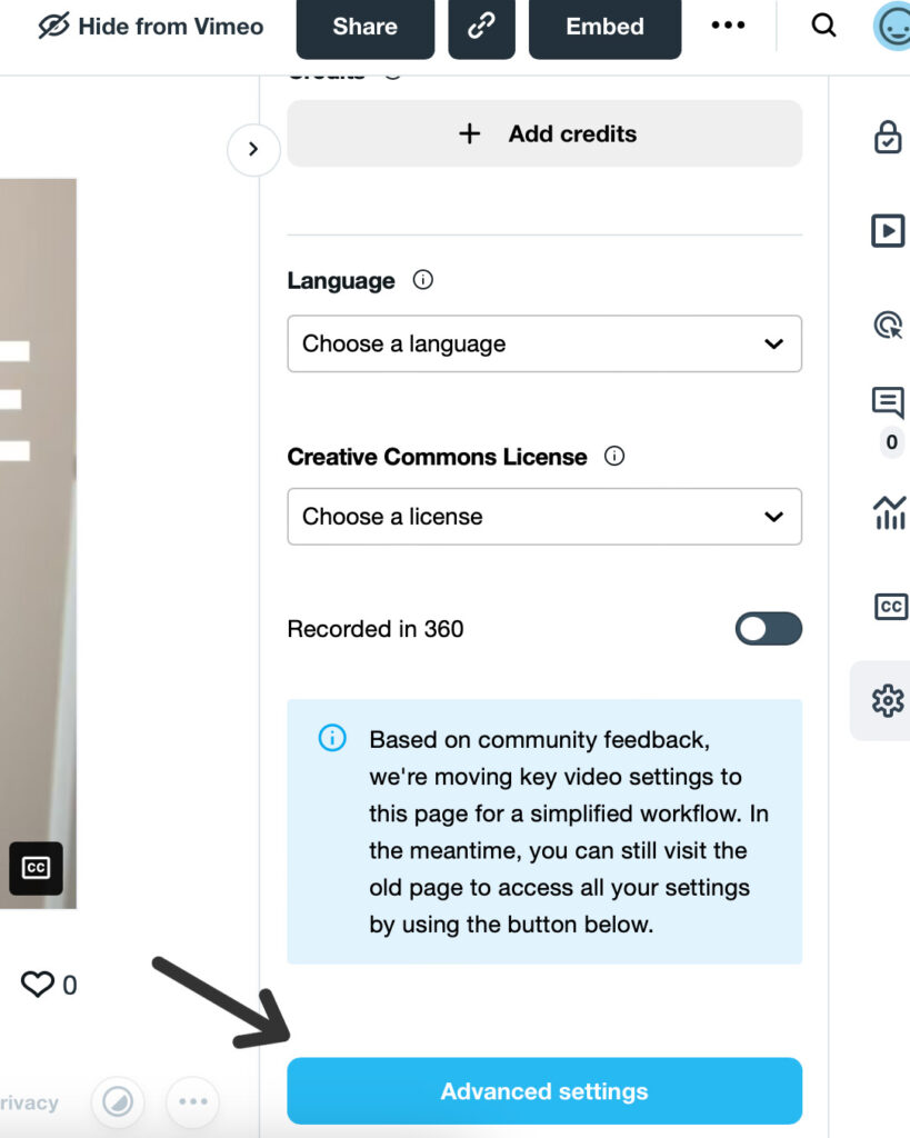 • Accedi al tuo video e clicca sulla rotella che trovi in fondo a destra e successivamente sul tasto Advanced settings.