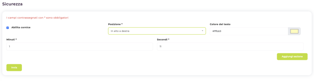 Puoi far apparire l’ID di Sicurezza più di una volta selezionando Aggiungi sezione e impostare quindi minuti e secondi differenti in modo che appaia più volte durante il video.